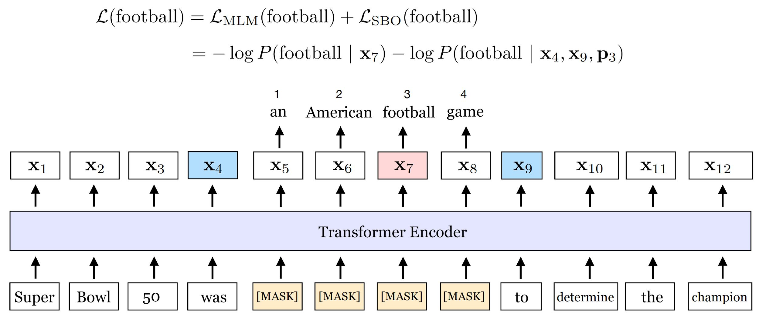 (1) Span Masking : 연속된 토큰을 masking, span boundary token([MASK]의 앞 뒤 토큰)을 이용하고 SBO loss 추가.