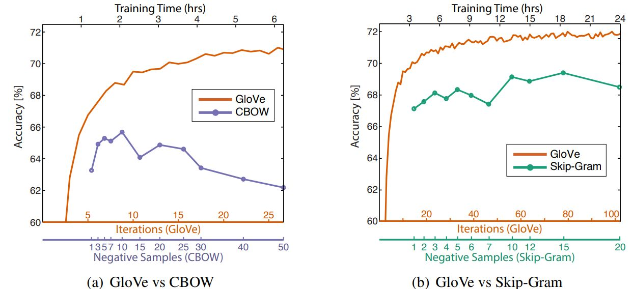 GloVe는 학습 ↑ Accuracy ↑, word2vec(CBoW, Skip-gram)은 과적합됨