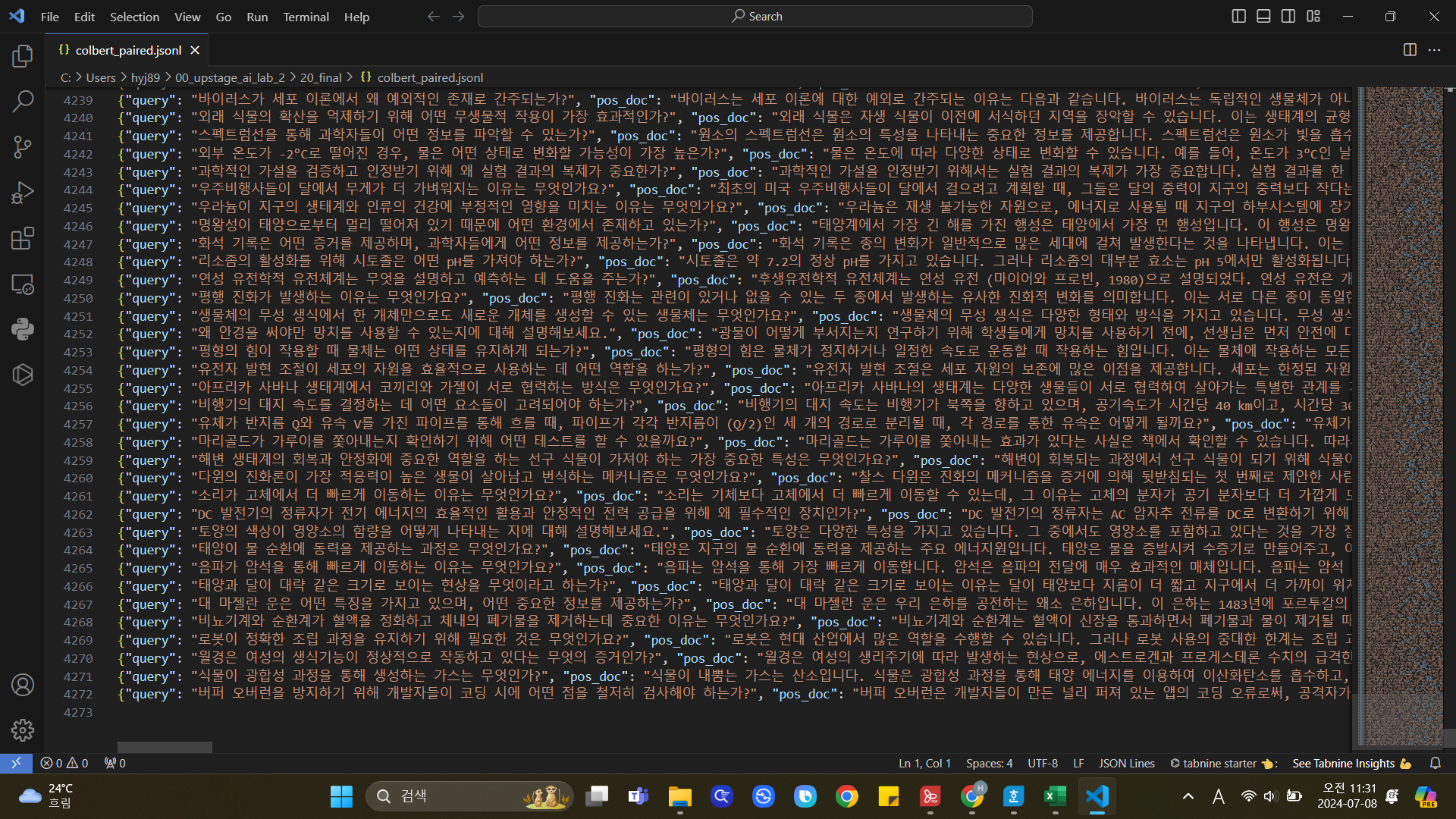 또한 220개 쿼리 중 과학(사회과학 분야 포함) 상식에 관한 쿼리는 200개 뿐이고 top3까지만으로 채점하기 때문에 evaluation에 활용되는 데이터는 600개 이하이고, 베이스라인만 실행할 경우 최소 3600 여개의 다큐먼트가 활용되지 못 한다. 따라서 주어진 데이터를 활용할 수 있는 방법이 두가지가 있는데, ① 쿼리-다큐먼트 페어를 만들어서 colBERT 학습에 사용하는 것과, ② validation set을 구성해서 (이 방법 또한 답지로써 쿼리와 다큐먼트 페어가 필요하다.) 프롬프트 혹은 function 정의에 대해 자체 검수 후 전체 파이프라인을 돌리는 방법이 있다.