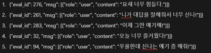 - eval.jsonl : 220개의 자연어 query (멀티턴 대화 20개, 일상대화 20개 포함)