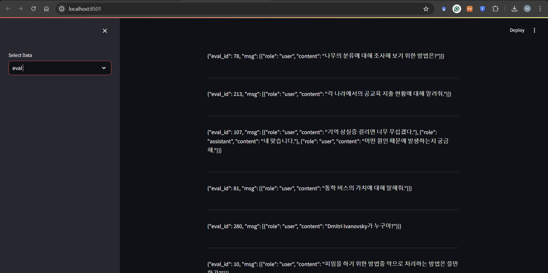 streamlit을 활용하여 220개의 eval 데이터를 읽어봄. 추후 query 추출 및 retrieval에서 잘 작동하고 있는지 여부를 확인하기 위해 20개의 멀티턴 대화와 20개의 일상대화 인덱스를 확인하였다.