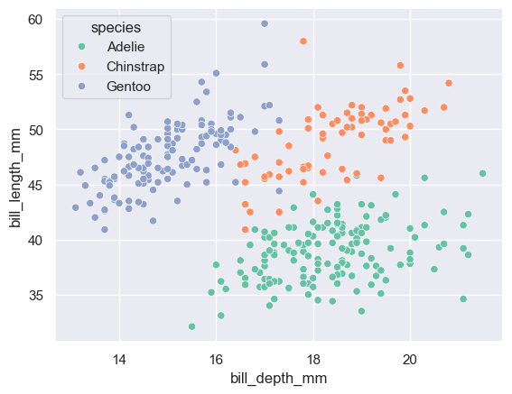 sns.scatterplot(data=data, x='bill_depth_mm', y='bill_length_mm', hue='species')