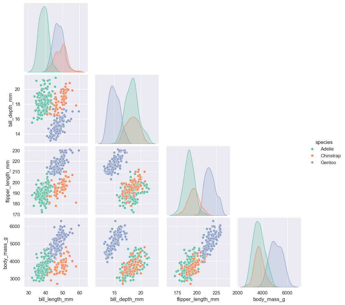 sns.pairplot(data=data, hue='species', corner=True)