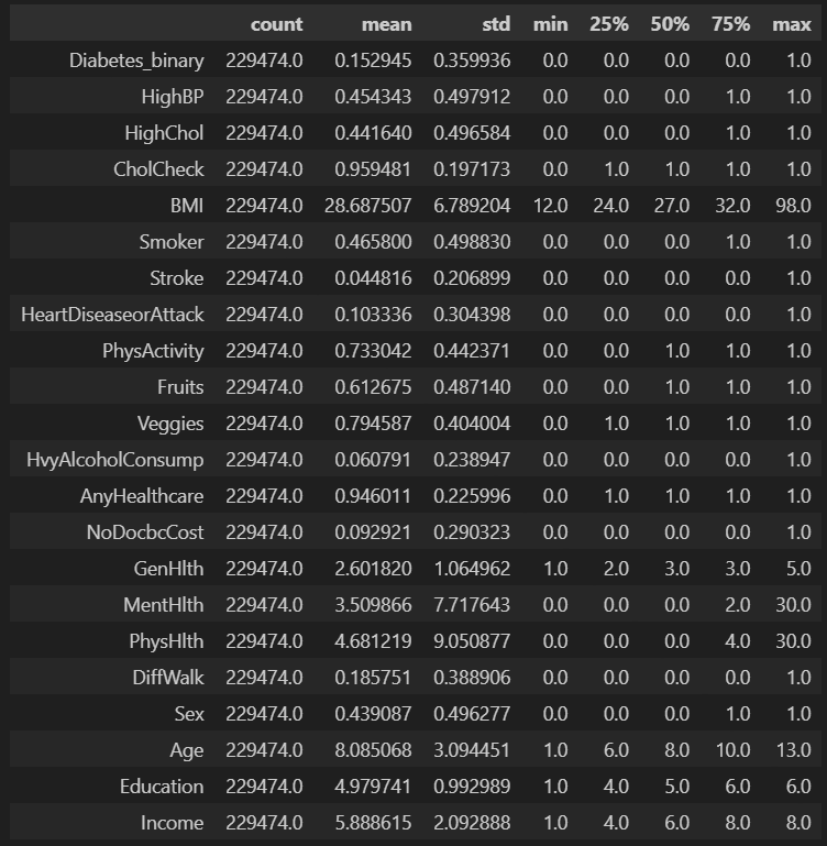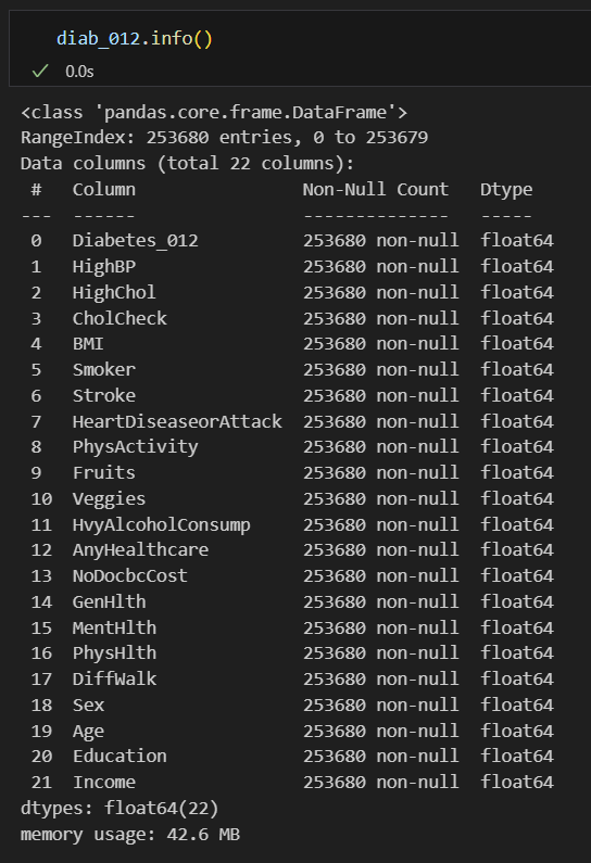 ['Diabetes_binary', 'HighBP', 'HighChol', 'CholCheck', 'BMI', 'Smoker', 'Stroke', 'HeartDiseaseorAttack', 'PhysActivity', 'Fruits', 'Veggies', 'HvyAlcoholConsump', 'AnyHealthcare', 'NoDocbcCost', 'GenHlth', 'MentHlth', 'PhysHlth', 'DiffWalk', 'Sex', 'Age', 'Education', 'Income']