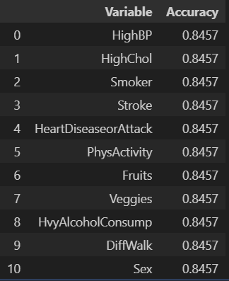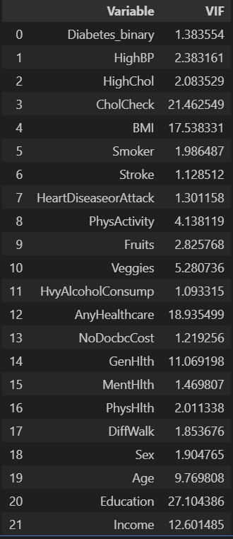indep_vars = ['HighBP', 'HighChol', 'Smoker', 'Stroke', 'HeartDiseaseorAttack', 'PhysActivity', 'Fruits', 'Veggies', 'HvyAlcoholConsump', 'DiffWalk', 'Sex']