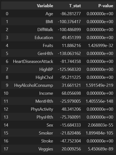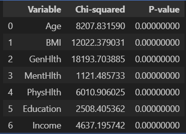 'GenHlth', 'Age', 'Education', 'Income', 'BMI', 'MentHlth', 'PhysHlth' 변수에 대한 p_value 모두 0.05 이하