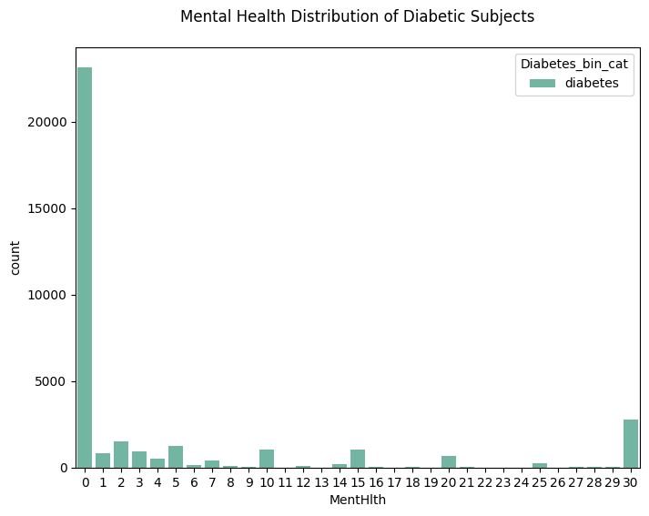 plt.title('Mental Health Distribution of Diabetic Subjects', pad=20)