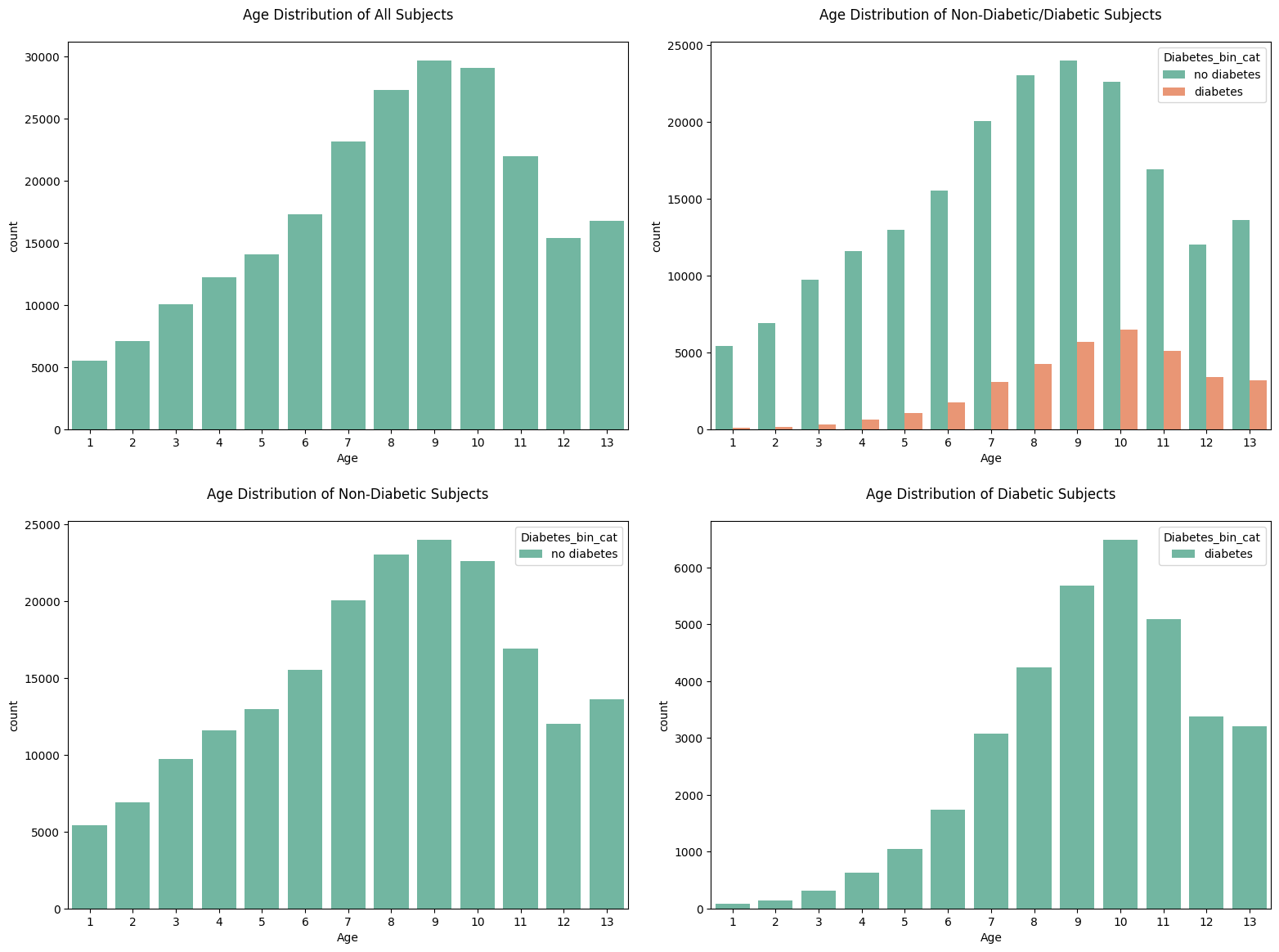 axes[0, 1].set_title('Age Distribution of Non-Diabetic/Diabetic Subjects', pad=20)