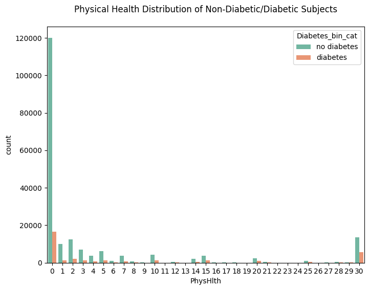 plt.title('Physical Health Distribution of Non-Diabetic/Diabetic Subjects', pad=20)