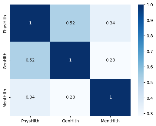 barplot, correlation sorting으로부터 'PhysHlth', 'GenHlth', 'MentHlth'간 상관관계가 높을 것으로 판단,