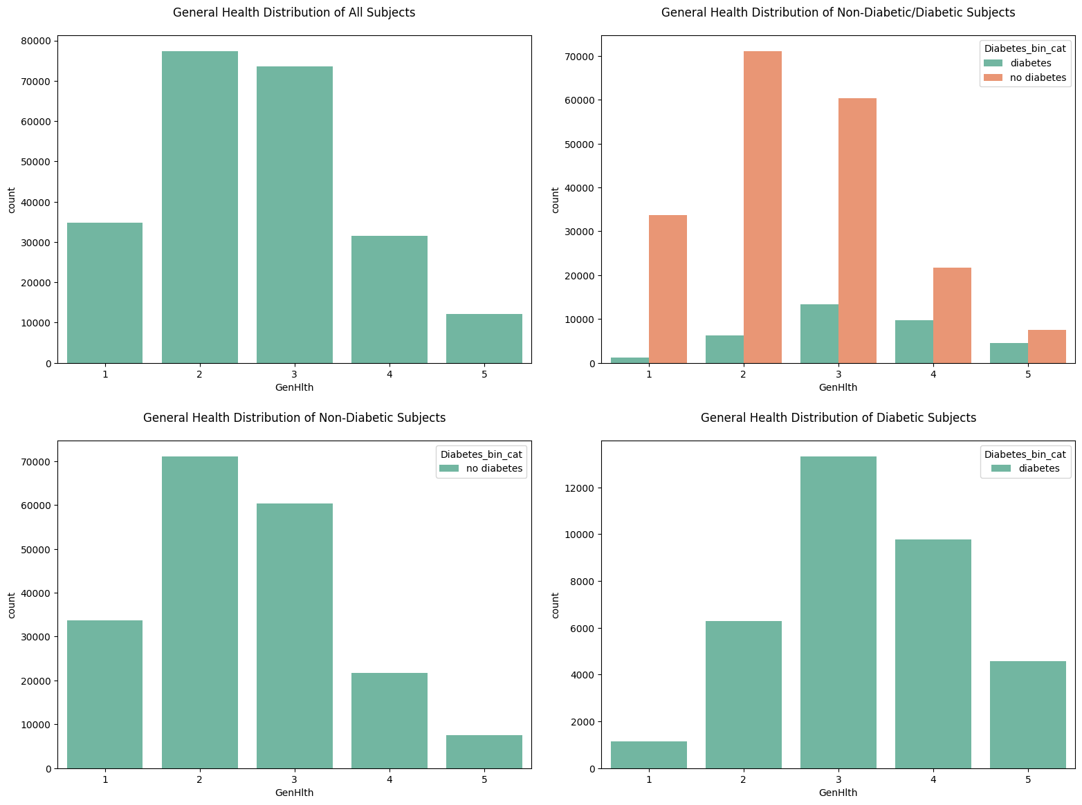 axes[0, 1].set_title('General Health Distribution of Non-Diabetic/Diabetic Subjects', pad=20)