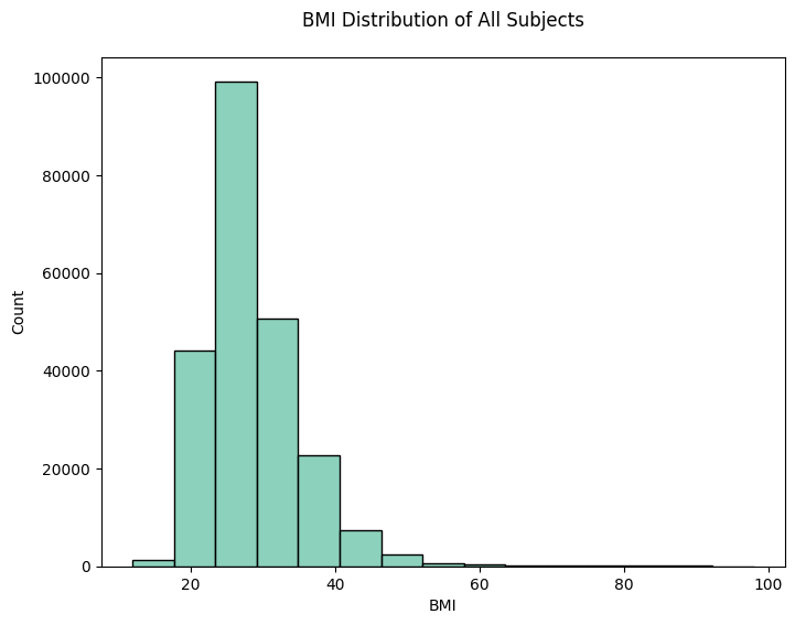 plt.title('BMI Distribution of All Subjects', pad=20)