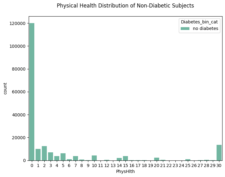 plt.title('Physical Health Distribution of Non-Diabetic Subjects', pad=20)