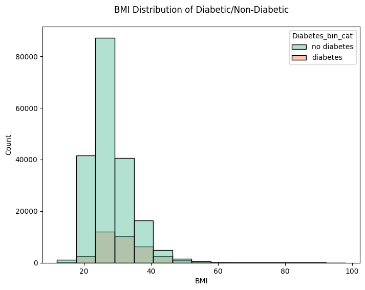 plt.title('BMI Distribution of Diabetic/Non-Diabetic', pad=20)