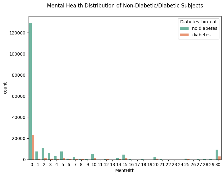 plt.title('Mental Health Distribution of Non-Diabetic/Diabetic Subjects', pad=20)
