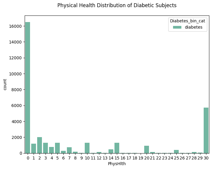 plt.title('Physical Health Distribution of Diabetic Subjects', pad=20)