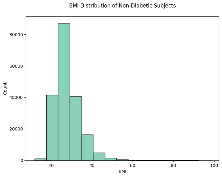 plt.title('BMI Distribution of Non-Diabetic Subjects', pad=20)