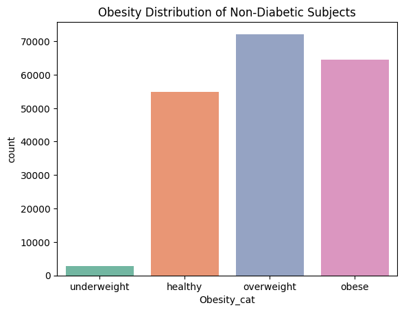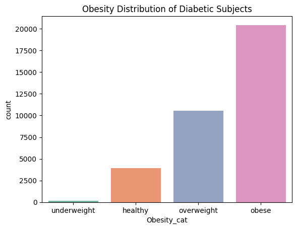지금까지는 BMI 지수 그대로 분포를 보고 있었는데 카테고리화하여 분포를 볼 필요성을 느꼈다. CDC의 설문 자료인 만큼 비만의 기준은 CDC기준으로 하여 우선 4개의 카테고리 ('underweight', 'healthy', 'overweight', 'obese')를 추가하였고, 혹시 필요할지도 몰라서 두 개의 binary column을 더 생성하였다. 하나는 overweight 이상인 경우('overweight' or 'obese' = 1)에 대한 binary data였고, 또 하나는 obese 여부에 대한 binary data였다.