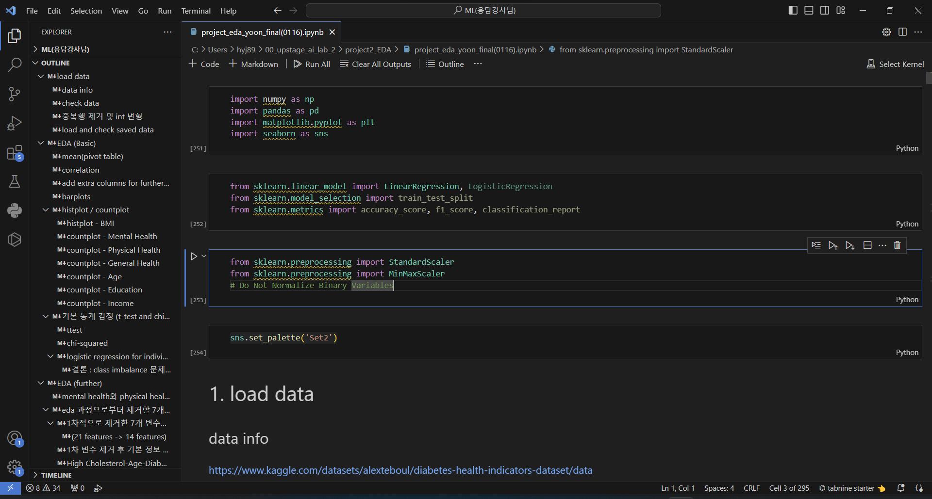 이를 바탕으로 조금 가닥이 잡혀서 일단 로지스틱 회귀 부분은 'Diabetes_binary_5050’ 자료로 진행하기로 방향을 수정하였다. 회귀를 진행하기에 앞서 scaling을 하는 것 또한 잊지 않았다.