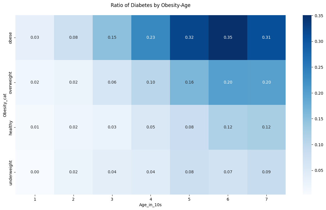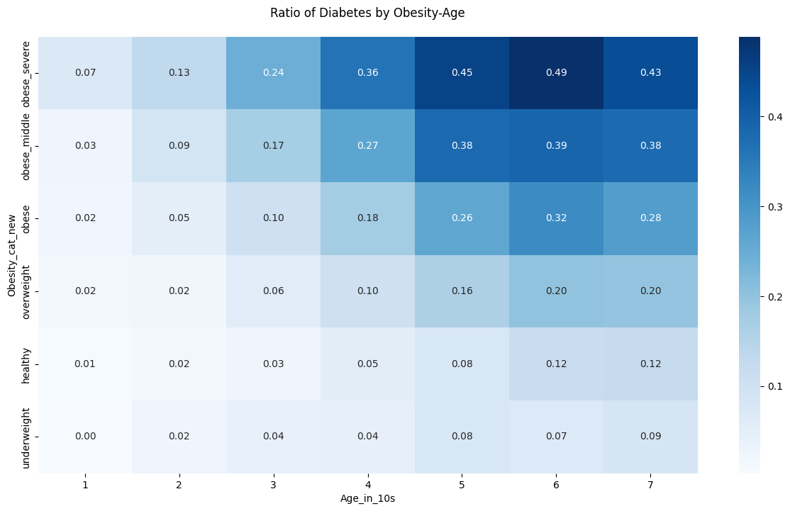 - 나이가 증가하면서 비만도도 증가하고 당뇨병 환자의 비율도 증가하는 경향을 확인할 수 있음.