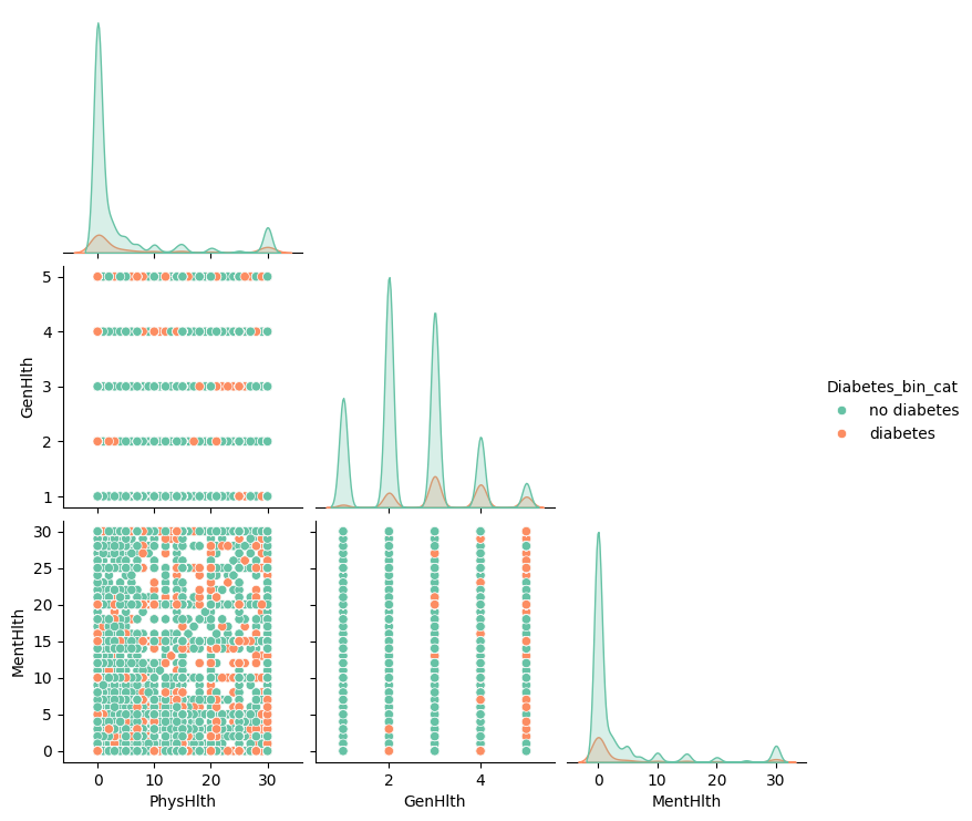 가장 큰 문제는 Mental Health, Physical Health 응답중 0의 비율이 너무 높았다. (MentHlth : 0.663801, PhysHlth : 0.595179) 이 부분을 어떻게 처리해야하나 고민이 되었다. 또한 상관계수 히트맵으로 보나, 설문의 형태로 보나 General Health, Mental Health, Physical Health가 scatterplot 상에서도 유의한 상관관계가 보이도록 플롯 될 것으로 예상했으나 전혀 다른 결과가 나왔다. 이 부분 역시 Mental Health, Physical Health에 대해 0으로 응답한 비율이 높아서 인 것으로 판단되었다. 이 부분에 대해 어떻게 처리할 것인지 논의가 필요했다.