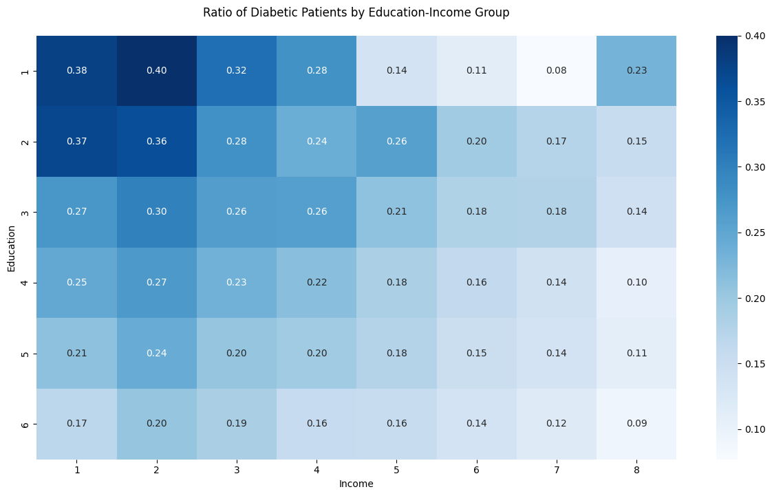 - Education이 낮고 Income이 낮아질수록 당뇨병 환자의 비율이 높아지는 경향을 확인할 수 있음
