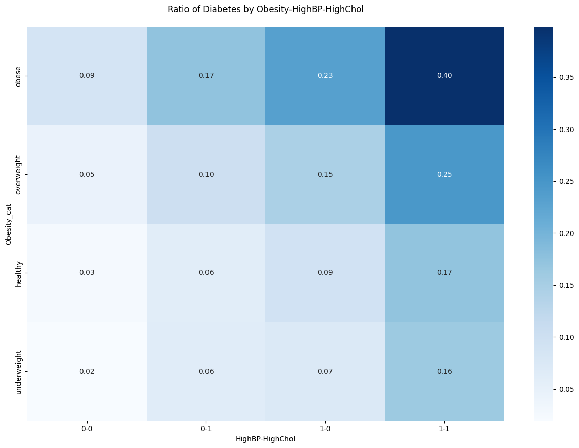 - (로지스틱 회귀 튜닝 과정에서) 'Obesity', 'HighBP', 'HighChol’가 특히 중요한 변수들로 판단되어 세 변수를 기준으로 당뇨병환자의 비율을 확인해본 결과 비만도 증가+고지혈증+고혈압의 조합으로 갈수록 당뇨병 환자의 비율이 높아지는 것을 확인 할 수 있음